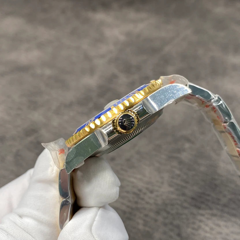 A striking 40 mm automatic diver-style watch that blends a deep blue dial with a gold-tone galvanic finish case. Designed to stand out, it merges elegance with high performance through a robust structure and luminous details, making it a perfect piece of everyday luxury.