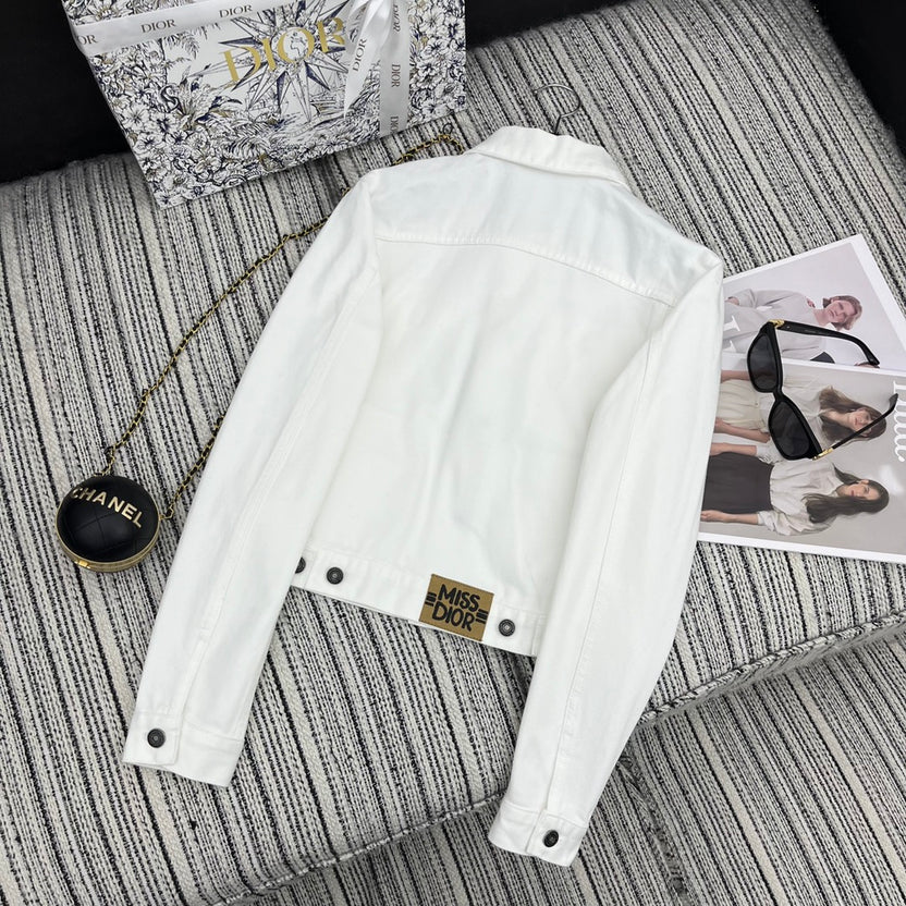 A stylish denim jacket from the Spring/Summer 24 collection, designed with a classic lapel collar and flap pockets. Enhanced with an embroidered logo and delicate bee embellishment, it adds a refined touch to a timeless silhouette. Versatile and easy to style, this jacket pairs effortlessly with both casual and chic outfits.